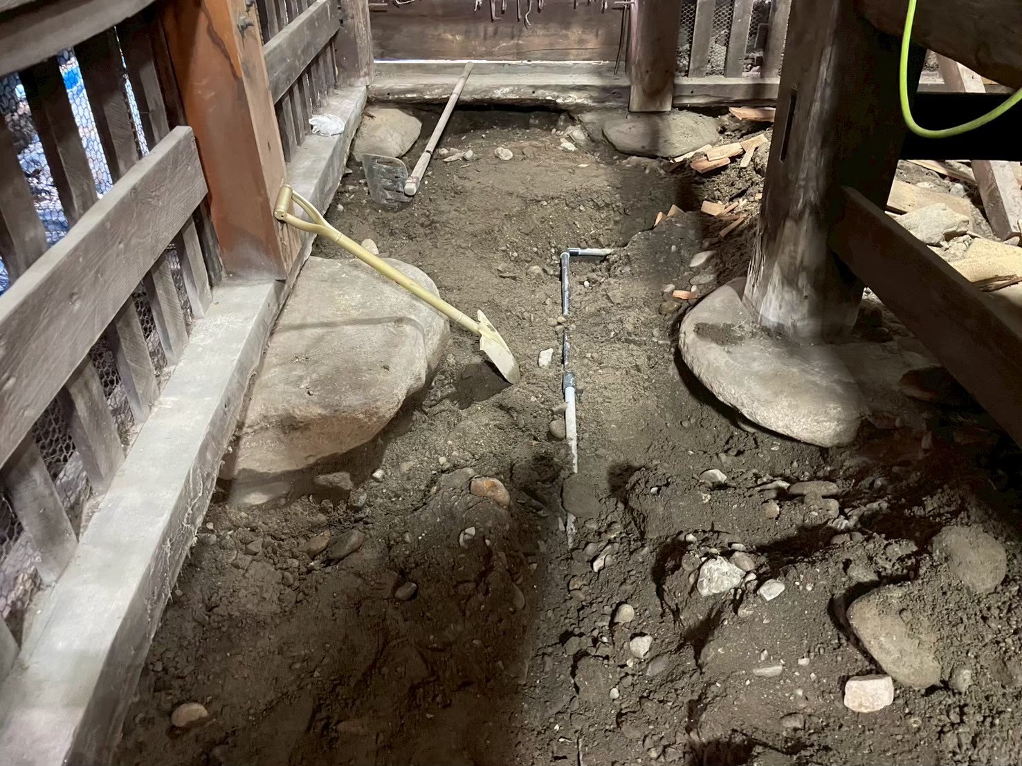 今回の基礎工事では先ずは礎石を残し、その周りを掘って鋤き土し、そこにコンクリートと鉄筋で補強工事(寝巻き)をしてから全面ベタ基礎とする計画である。